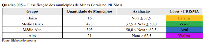 Com a média das três áreas de referência, o Prisma classifica os municípios em quatro níveis: Violeta (Alto), Azul (Médio Alto), Verde (Médio Baixo) e Laranja (Baixo). No portal, pode-se verificar as classificações por município, bem como as variáveis usadas em cada dimensão.