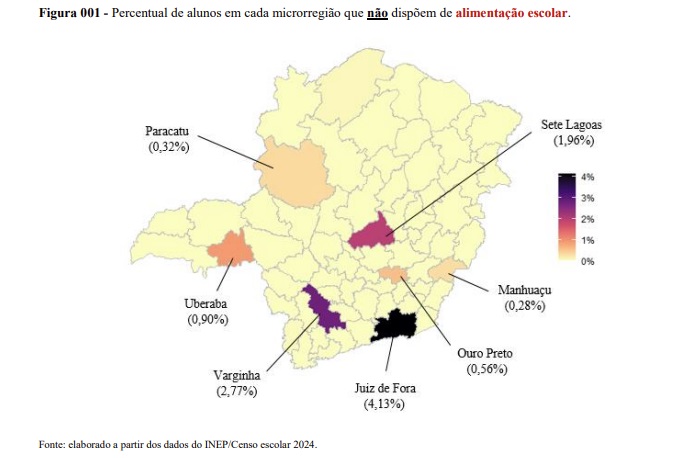 Na microrregião de Sete Lagoas, por exemplo, aproximadamente 1,96% das matrículas estão em unidades de ensino municipais que não oferecem alimentação escolar. Em Varginha, esse percentual passa para 2,77%. Nesse contexto, a microrregião de Juiz de Fora (cor mais escura na figura a seguir) apresenta o quadro mais preocupante: cerca de 4,13% dos alunos matriculados em 2024 não tinham acesso à alimentação escolar. Em outras seis microrregiões (Uberaba, Ouro Preto, Paracatu, Manhuaçu, Januária e Poços de Caldas), o percentual ficou abaixo de 1%.